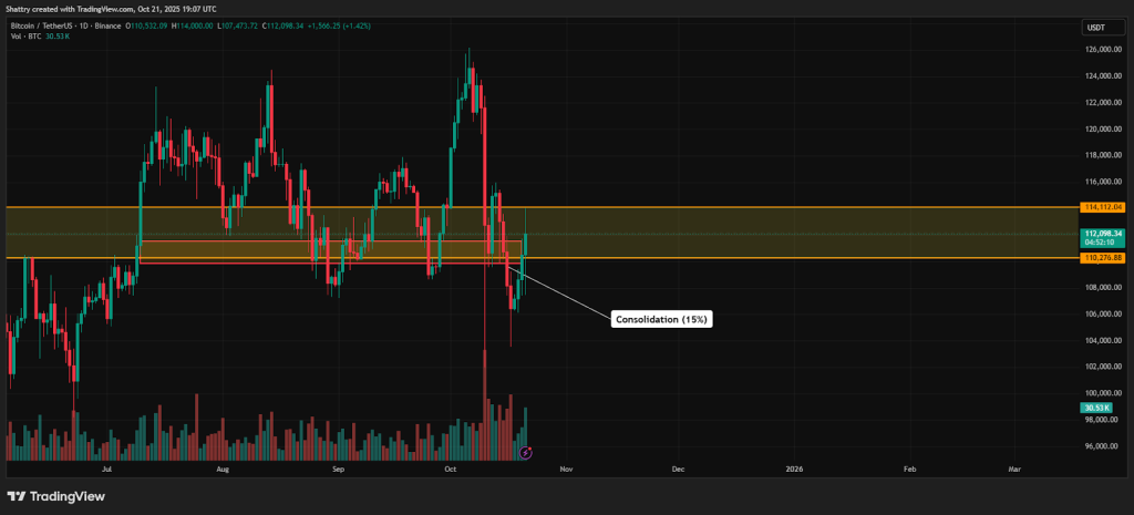 Bitcoin at $112,259 reflects a +1.56% daily gain and +6.7% bounce from the October 17 low of $105,191.