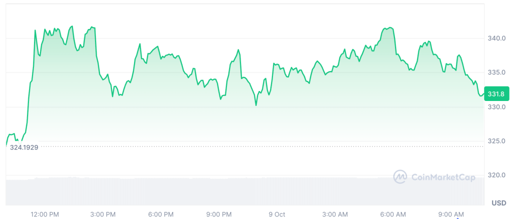 Monero is trading near $333, up just over 2% today. CoinMarketCap’s update this week flagged a reclaim of the 200-day moving average and a steady rise in volume, which helped shift sentiment. TradingView ideas around the same window pointed to supportive levels that encouraged dip buying.